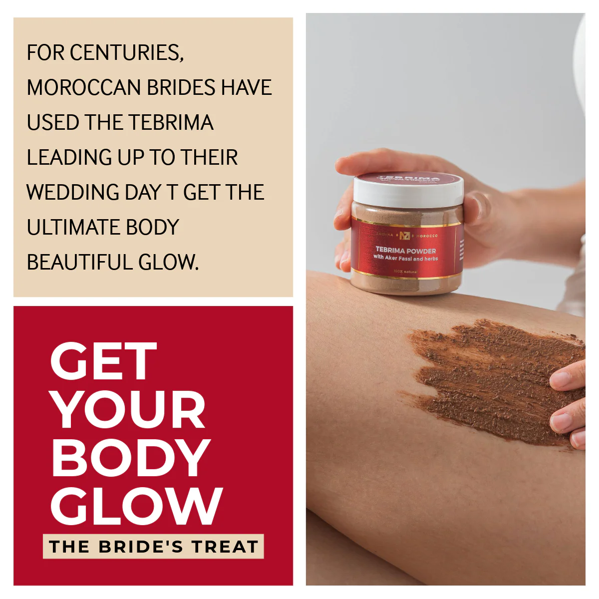 Step into the cherished tradition of Moroccan brides with Tebrima, a luxurious body mask crafted from an exquisite blend of herbs and flowers that gently purifies, deeply cleanses, and intensely nourishes, unveiling a luminous complexion and imparting a healthy, rosy glow as it rejuvenates the skin; integral to the Moroccan Hammam ritual following Black Beldi Soap and Kessa Glove exfoliation, Tebrima powder can be elevated into the ultimate brightening body treatment when mixed with Nila liquid soap, offering a timeless beauty secret to reveal your most radiant skin.